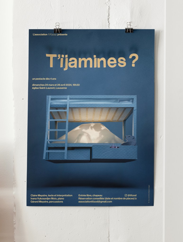 Illustration et affiche pour le spectacle T’ijamines ?, créé en mars 2024 à Lausanne par Claire Meystre (texte et interprétation), Ivana Vukosavjlev Moix (piano) et Gérard Meystre (percussions).