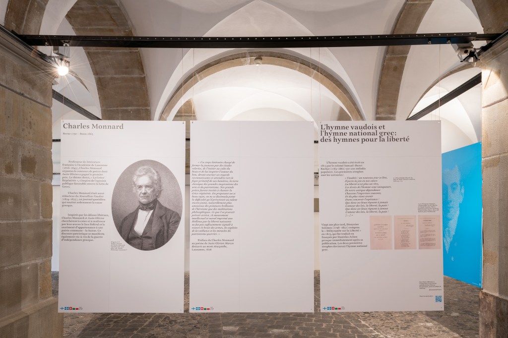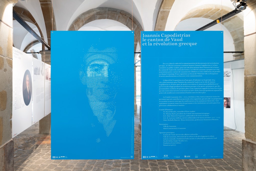 Scénographie et graphisme pour l’exposition Ioannis Capodistrias, le canton de Vaud et la révolution grecque, forum de l’Hôtel de Ville de Lausanne, juin 2021.